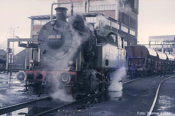 Ein halbes Jahr später, am 14.04.1985, konnte Werner Knüfer die Lok nach einem heftigen Regen am Wilhelmssschacht im Bild festhalten.